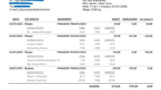 Tylko za czerwiec wizyta i zakupienie leków dla Brunia (4 kroplówki 250 ml Optylite, 3 listki Amylactive Digest 1 Amodip 1.25 mg i Solensja) kosztowały mnie 632 zł. Wiedząc, jak kruchy jest jego organizm obawiam się również wydatków związanych z nadprogramowymi wizytami.