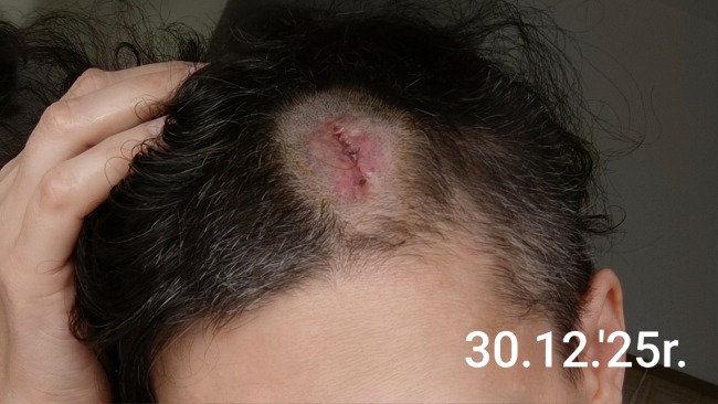 Około 2,5-3 tygodnie po zabiegu wystąpiły objawy zakażenia rany na głowie, nad czołem: silny czerwony obrzęk, wyciek płynu surowiczego.