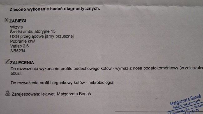 - zakup specjalistycznej karmy mono + probiotyki, leki, antybiotyki