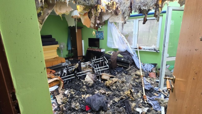 Zniszczone wnętrze domu po pożarze, z uszkodzonym dachem i meblami.