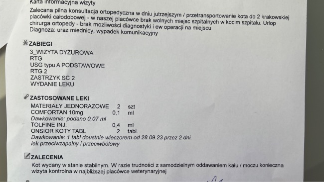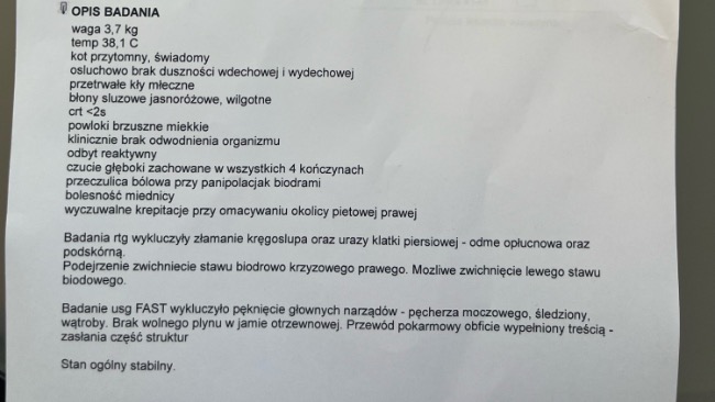 EDIT: obecnie leczenie kota wyniosło 4100zl(bez zabiegu) koszt zabiegu to dodatkowe 3000zl..Dostał silnej anemii, ogromnego krwiaka - przez którego nie można na obecna chwile dokonać zabiegu. Kot jest pod ciągła hospitalizacja z czym wiążą się ogromne koszta, krwiak jest laserowany, kot jest cewnikowany gdyż sam nie może się na obecna chwile załatwiać (prawdopodobnie z bólu związanego z krwiakiem)