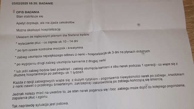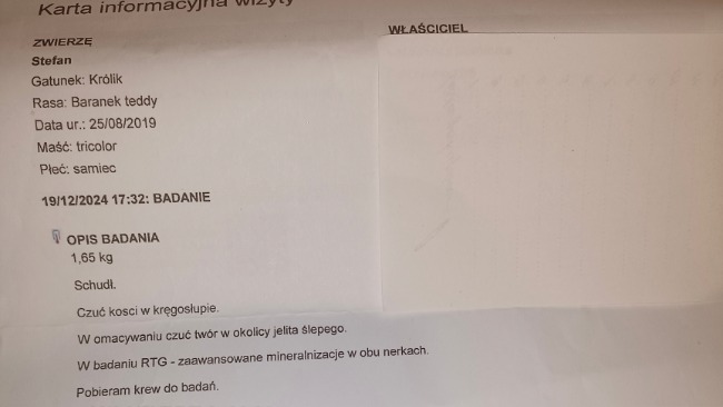 Zwracam się z ogromną prośbą o pomoc, mój kochany króliczek Stefan potrzebuje operacji ratującej życie. W grudniu po wizycie u weterynarza i wykonuj zdjęcia rentgenowskiego dowiedzieliśmy się, że Stefcio ma zaawansowaną mineralizację w obu nerkach . Zaczęliśmy od razu leczenie farmakologiczne. Stefek odzyskał siły i wyniki krwi się poprawiły, niestety nie trwało to za długo. Na początku lutego Stefan znowu poczuł się gorzej, zaczęły mu się rozjeżdżać łapki, nie był w stanie wstać. Niezwłocznie udaliśmy się do naszej Pani weterynarz, która stwierdziła zapalenie płuc, musiał zostać hospitalizowany, ponieważ potrzebował intensywnej pomocy. Stefek przez chorobę nerek ma bardzo obniżoną odporność. Na całe szczęście udało się go uratować. Teraz Stefan pilnie potrzebuje operacji usunięcia kamieni z nerek. Stan nerek pogarsza się i bez zabiegu może dojść do kolejnego pogorszenia, zapalenia płuc i śmierci. Koszt operacji jednej nerki to około 1000 zł, a Stefek potrzebuje operacji obydwóch nerek.