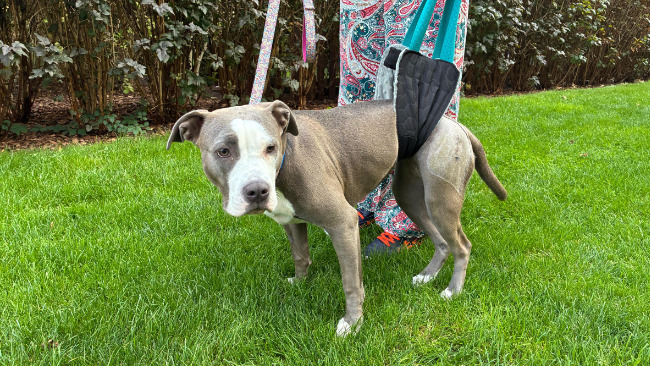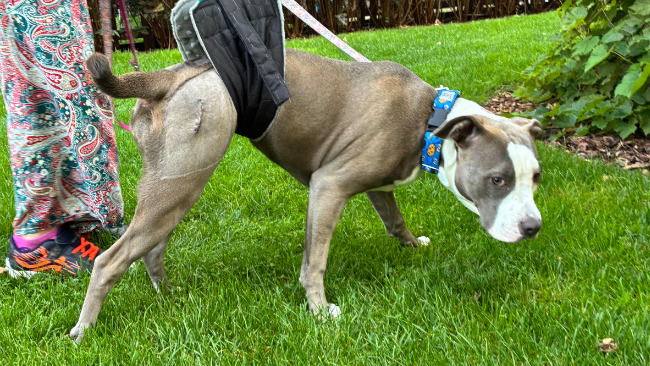 Teraz przed nami najtrudniejsza część powrotu zdrowia - rehabilitacja. Tami na razie nie chodzi, jest noszona na temblaku. Codziennie jeździmy na fizjoterapię, ćwiczymy w domu, pracujemy nad tym, aby nauczyła się od nowa używać tylnych łap.