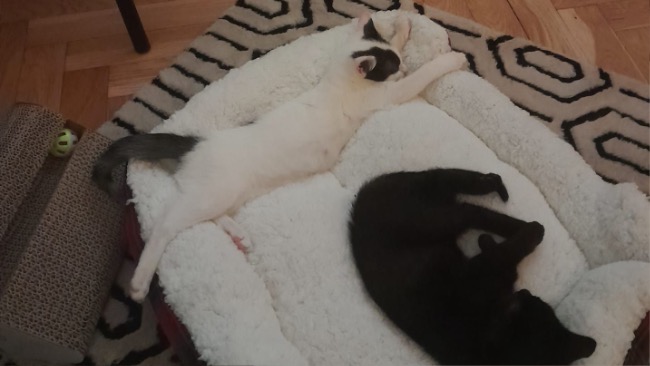 Przez pierwsze dwa tygodnie Tarta i Bezik przebywali więc w odizolowanym pomieszczeniu, w klatce. Obsługiwaliśmy je w rękawiczkach, zmieniając ubrania, zachowując pełną bioasekurację — wszystko po to, by nie narazić ich na kontakt z chorobami krążącymi wśród dorosłych kotów. 🧤