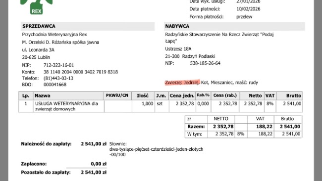 Na kwotę zbiórki składa się: usunięcie zmiany z ucha, kontrola, leki.