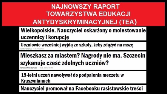 Przez cały rok 2015 monitorowałyśmy media ogólnopolskie i regionalne wyszukując informacje na temat przypadków dyskryminacji i przemocy w szkołach w Polsce. Każdego miesiąca wybierałyśmy kilka konkretnych zdarzeń, o których alarmowały media i podejmowałyśmy w tych sprawach interwencje. Korzystając z dostępu do informacji publicznej pytałyśmy odpowiednie instytucje, co w danej sprawie zrobiły.