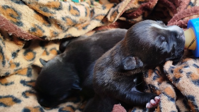Za nim otworzyliśmy oczy Mama już nas nie chciała .Trzy Maluchy potrzebują Pomocy. Matka zaraz po porodzie zaczęła zagryzać szczeniaki z 12 zostały 3 . W porę zostaly zabrane, niestety dwa ucierpiały tracąc ucho i raniąc. Mają dopiero tydzień