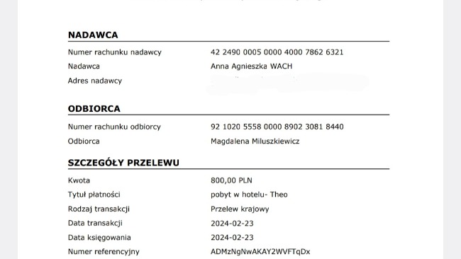 Przelew za transport do hotelu: