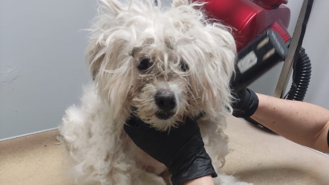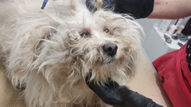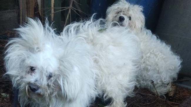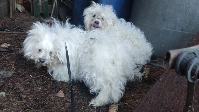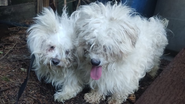 Sunie znalezione w okolicach giełdy, prawdopodobnie wyrzucone. Ich stan był opłakany. Wychudzone, skrajnie zaniedbane. Obie sunie to był śmierdzący polepiony filc, kołtuny, kał i podrażniona skóra. Sierść, która była z nich zgolona, odchodziła praktycznie w całości. Jedna z nich, Neska nie tylko jest bardzo wycofana i boi się ludzi. Na USG wyszedl u niej guz na śledzionie 😞