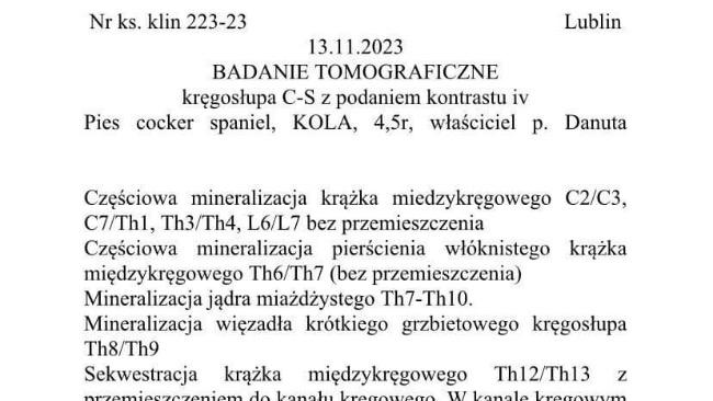 Kola to oczko w głowie całej naszej rodziny, a najbardziej jej właścicieli-moich dziadków. Nie jest tylko domowym zwierzakiem, to nasza przyjaciółka, członek rodziny. Przez 4 lata jej życia, wniosła wiele radości, szczęścia, wspierała w trudnych chwilach- po prostu zmieniła nasze życie na lepsze. Kolcia jest bardzo energiczna i żywa, uwielbia smakołyki i długie spacery. Pare dni temu wszystko się zmieniło, jej życie stanęło pod znakiem zapytania….. nagle przestała chodzić na tylne łapki, z wesołego pełnego energii pieska stała się smutna, nie chce się bawić, nie cieszy się na widok najbliższych, chowa się. Wiele wizyt u różnych weterynarzy i specjalistów oraz szereg drogich badań dało diagnozę-DYSKOPATIA