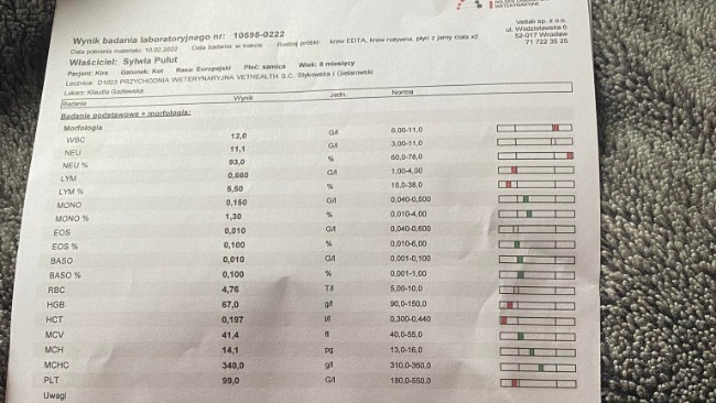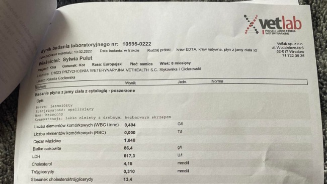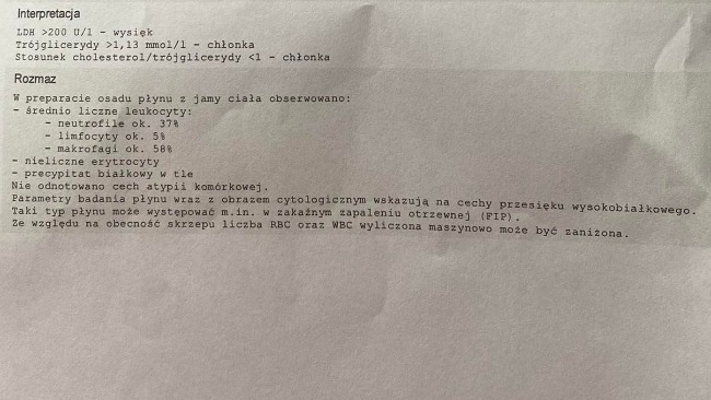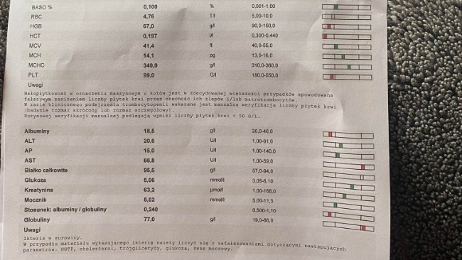 Poniżej udostępniamy Wam wyniki koteczki w okolicach 30 dnia leczenia, obecnie jesteśmy na 43/84 dni i walczymy dalej ❤️ prosimy o dalsze wsparcie, ponieważ na dniach musimy zakupić kolejne fiolki leku 🙏