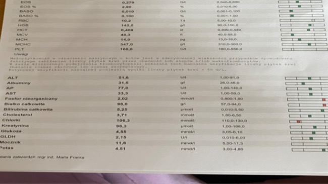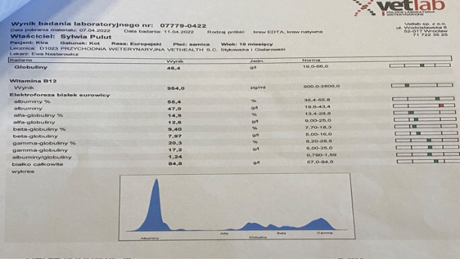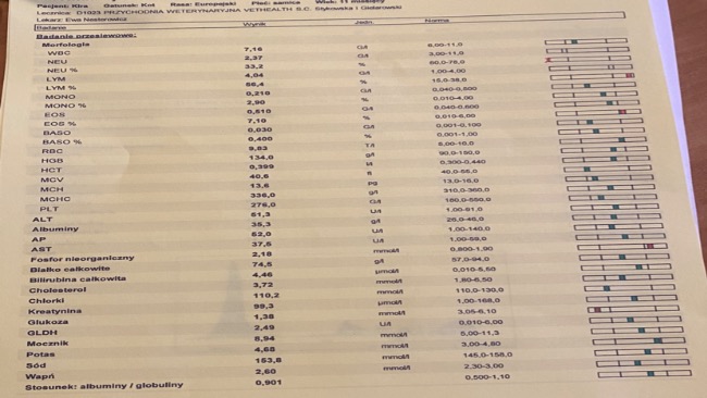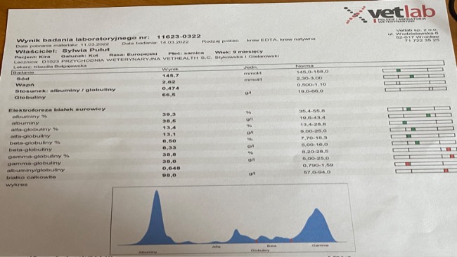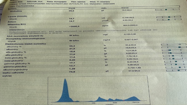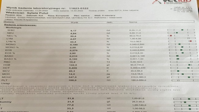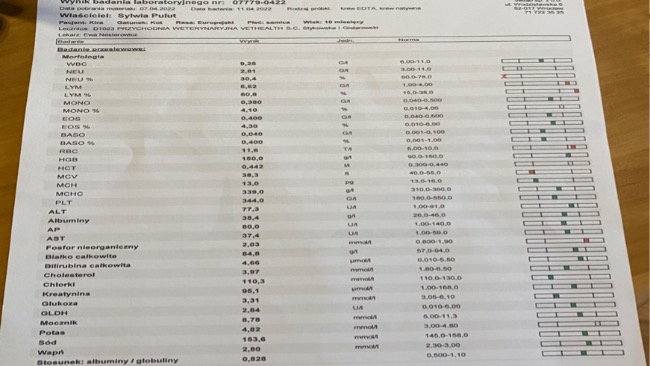 Kochani, idzie nam coraz lepiej. Zobaczcie nasze wyniki krwi z około 60 dnia leczenia🐈 niedługo będę miała zabieg sterylizacji, trzymajcie kciuki, żeby wszystko było dobrze bo moja mama trochę panikuje ale ja wiem, ze dam radę bo jestem dzielna i tyle już przeszłam, ze nic mi się straszne!