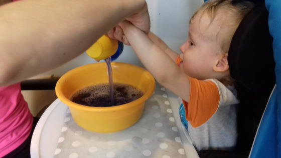Uczę się chodzić z pomocą pchacza, choć pchanie jest dla mnie bardzo trudne, przez rączki, które niepotrzebnie chcą się zginać...