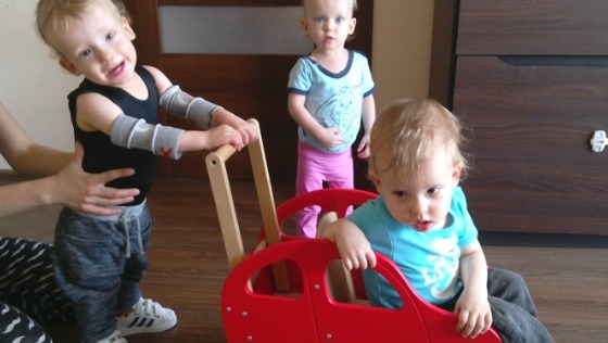 Pozornie wyglądamy tak samo - może nie w sensie dosłownym - nie widać tu, żebym był od Rodzeństwa mniej sprawny. Niestety to tylko pozory, bo na zdjęciu wszyscy siedzimy. Fakt, właśnie nauczyłem się siedzieć (posadzony) i jestem z siebie bardzo dumny! Ale mam już 2 lata, a moje Rodzeństwo (żeby nie było wątpliwości - urodziliśmy się tego samego dnia) i inni zdrowi rówieśnicy, od dawna potrafią samodzielnie siadać, stawać, chodzić, wspinać się, samodzielnie jeść, uczą się skakać. Mogą robić o wiele więcej rzeczy, niż ja. A ja jestem mądrym chłopcem, wszystko rozumiem i też chciałbym być sprawny! Nigdy nie będę zdrowy i całkowicie sprawny jak zdrowe dzieci, ale chce zrobić wszystko, by nauczyć się samodzielnie chodzić, bez pomocy dorosłych bawić się z innymi dziećmi... I samodzielnie radzić sobie w życiu!
