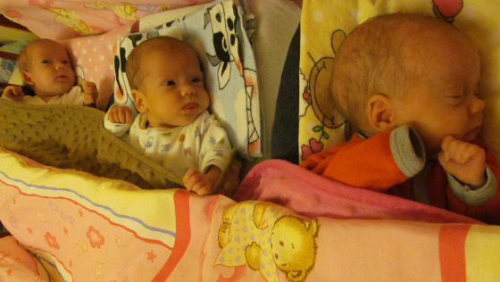 Gdy wróciliśmy do domu, oprócz normalnej codzienności, jaka jest zwykle po powrocie noworodka do domu (u nas powrót noworodka x 3 :) ), było mnóstwo regularnych wizyt u specjalistów. Od neonatologa, poprzez okulistę, audiologa, po rehabilitanta i neurologa. Codzienność wcześniaków i Ich Rodzin... Oprócz tego ja miałem jeszcze ryzyko bezdechów (nie muszę mówić, jakim stresem było to dla moich Rodziców) , więc mój oddech pod czas snu, kontrolowany był przez specjalny monitor oddechu... Nie mogłem więc niestety zostać w jednym łóżeczku z Polą i Michałkiem, tak jak leżymy na zdjęciu. Dostałem swoje łóżeczko i swój monitor...