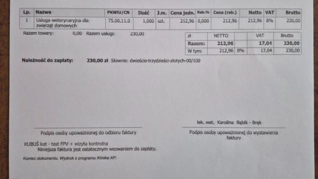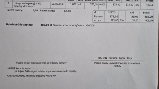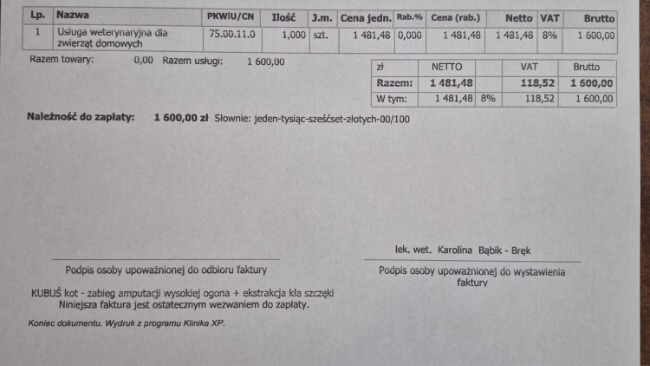 Nie licząc się z kosztami ruszyliśmy z pomocą. Niestety koszty są dość wysokie jak dla naszej malutkiej fundacji. Ubiegły rok zakończyliśmy z długiem rzędu 16 tyś. Bardzo prosimy o pomoc w opłaceniu faktur za leczenie tego kotka, żebyśmy mogli dalej pomagać kolejnym zwierzętom.