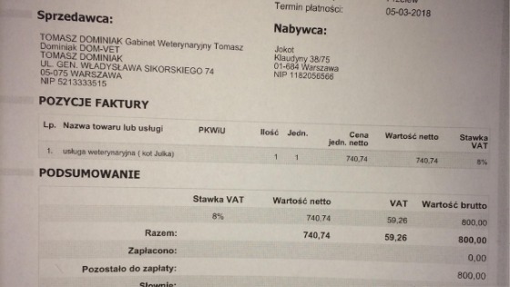 Faktury dotyczą m.in. kota Solfernusa, który dzięki Państwa pomocy przeżył i pokonał złośliwego raka płaskonabłonkowego!! Faktura dotyczy ostatnich wizyt kontrolnych. Poniżej na zdjęciu stan po operacji i teraz pokazuje że warto było pomóc!!