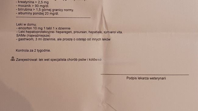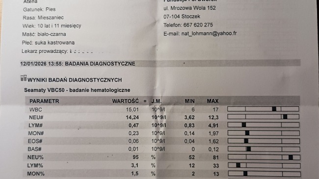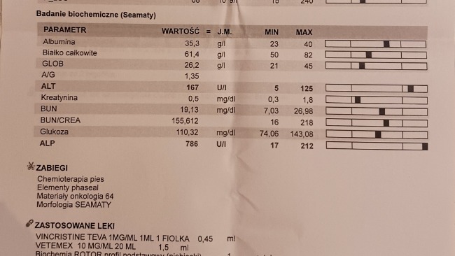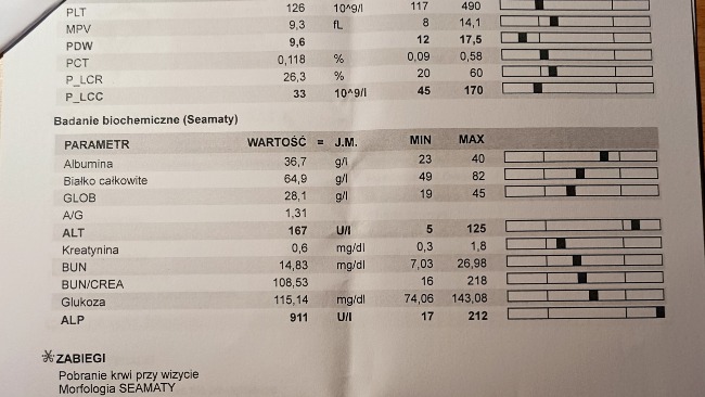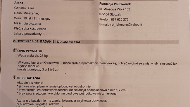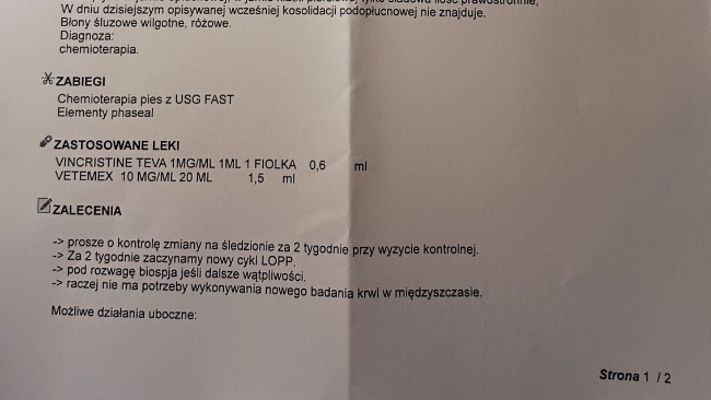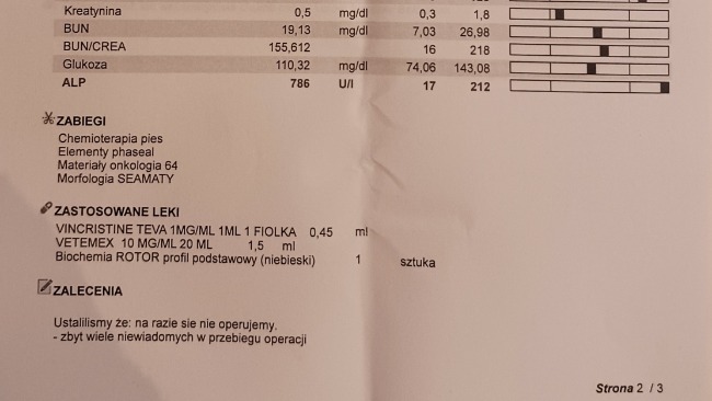 Wyniki badania krwi są stabilne. Płyny w jamie opłucnej są w śladowej ilości. Guz tym razem nie był widoczny na USG. Natomiast lekarz onkolog odkrył dwa guzy na śledzionie, które będą obserwowane i być może będą wymagały biopsji.