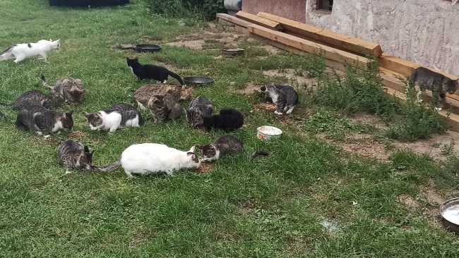 Koty ciągle się rozmnażają, nie ma kto ich karmić, bo nie ma na to funduszy, czasami ktoś rzuci im tzw. "zlewki" z obiadu, a ich stan jest bardzo zły: są zarobaczone, mają pchły i kleszcze, koci katar. Na ile możemy sobie pozwolić to za własne finanse kupujemy kilka puszek karmy kociej, ale taką ilością nie jesteśmy w stanie wykarmić takiej ilości zwierząt. Ich właścicielka jakiś czas temu zmarła, rodzina nie przyznaje się do kotów, a one rozmnażają się coraz bardziej i przybywa ich coraz więcej. Gminy nie interesuje ich los, nie dadzą karmy, niech koty głodują, kotów nie złapią.