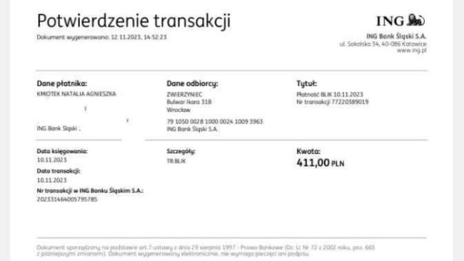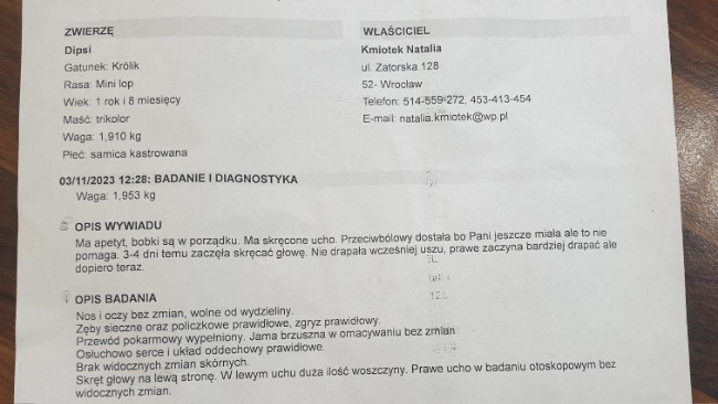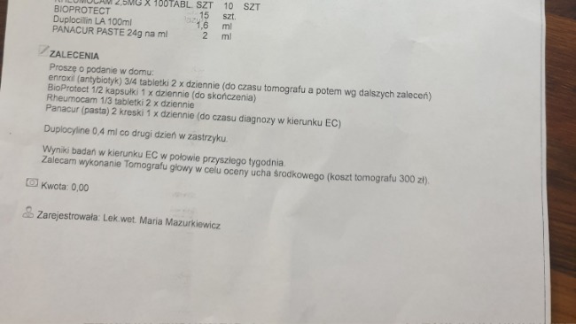 Jesteśmy już po tomografie, który nie wykazał stanu zagrażającego życia, lecz DIPSY została skierowana na zabieg oczyszczający jej ucho oraz zniwelowanie jej bólu. Sam zabieg to jest około koszt 500 zł. Opisy wizyty oraz fakturę będziemy mieli poniedziałek / wtorek ponieważ teraz jest dłuższy weekend, lecz załączę potwierdzenie płatności za wizytę - około 100/150zł. We wtorek po 13 DIPSY ma kontrolę jeśli jej stan będzie kwalifikował ją do zabiegu to wtedy będzie on wykonany.