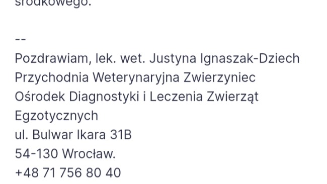 Na początku nie wiedzieliśmy ze to coś poważnego ale na kolejny dzień wciąż to się utrzymywało, i nie zwłocznie wybraliśmy się do weterynarza, który znajduje się we Wrocławiu Zwierzyniec, mimo iż byliśmy nie umówieni to klinika nas przyjęła.