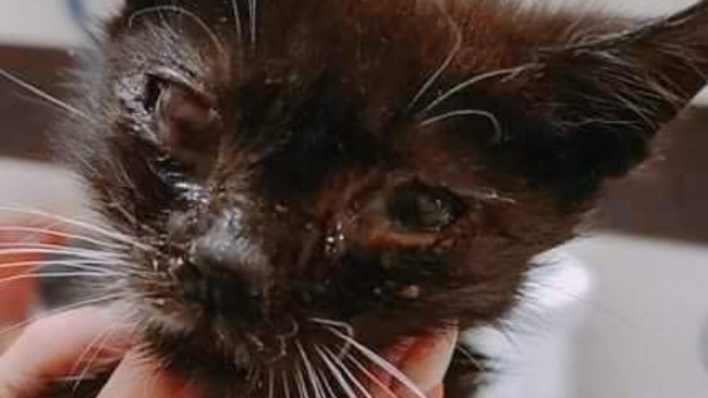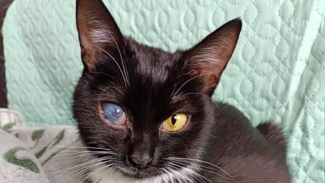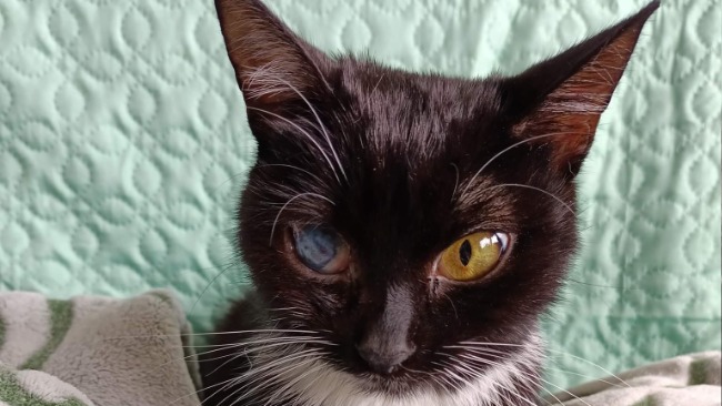 Czarna od urodzenia nie miała lekko. Urodzona jako "ente" kociątko w podzamojskiej wsi, bez odpowiedniej opieki i pożywienia w wieku dwóch miesięcy zachorowała na koci katar. Odebrałam ja z zaropiałymi i zakrwawionymi oczami, z biegunką i niedowagą. Jednego oka nie udało się uratować, jest niewidome.