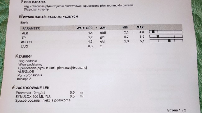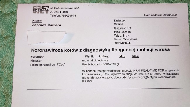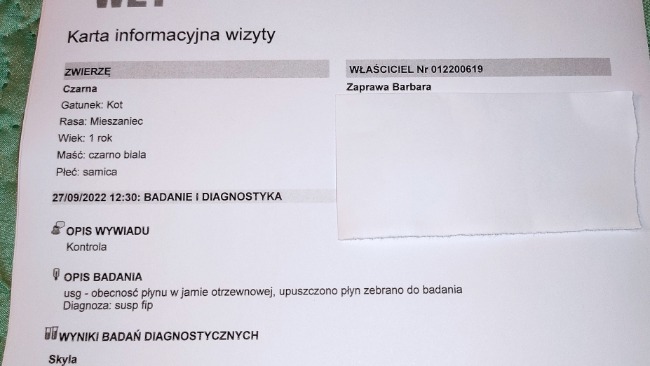 Po kilku dniach badań, usłyszałam wyrok - płyn w otrzewnej, w Polsce nie ma na to leku. Zalecana jest eutanazja, jednak istnieje alternatywna forma terapii, lek jest sprowadzany zza granicy i jest potwornie drogi. Tak wygląda walka o zycie. Wiele kotów to życie wygrało, teraz walkę podjęła moja Czarna.