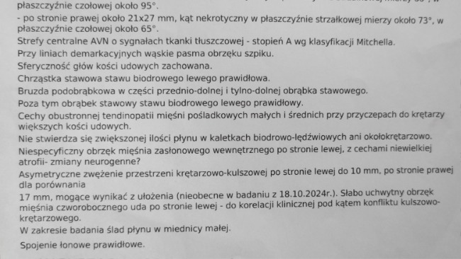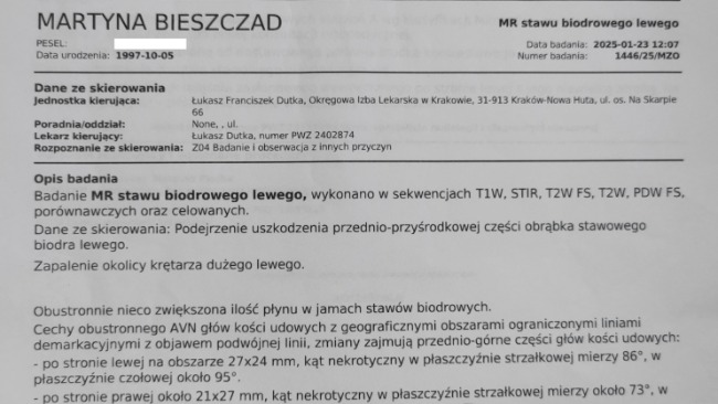 Jedną z moich chorób jest jałowa martwica głów kości udowych. Obecnie z powodu ogromnego bólu nie daję rady już samodzielnie stać, chodzić ani wykonywać czynności życia codziennego. Czeka mnie operacja Forage Arthrex. Jednak jest to tylko tymczasowe rozwiązanie i nie daje gwarancji poprawy - lekarze przewidują, że w przyszłości będę potrzebować wszczepienia endoprotez bioder. Dodatkowo występuje u mnie tendinopatia i zmiany entezopatyczne.