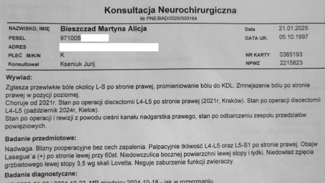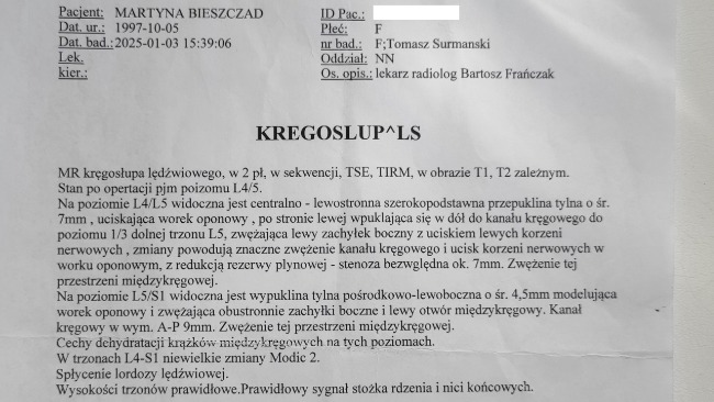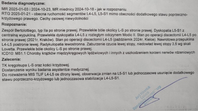 Mimo młodego wieku przeszłam już dwie operacje kręgosłupa - w 2021r (gdy miałam 23 lata) oraz w 2024r. Niestety po drugiej operacji doszło do porażenia nerwów: mam niedowład lewej stopy oraz niedoczulicę lewej łydki i stopy. Teraz konieczna jest kolejna, znacznie poważniejsza i bardziej skomplikowana operacja: usunięcie nieprawidłowego stawu poprzeczno-krzyżowego oraz odbarczenie uciskających nerwy przepuklin z równoczesnym zastosowaniem stabilizacji TLIF L4-L5-S1. Ze względu na rzadkość występowania zespołu Bertolottiego oraz trudność zabiegu, operację może wykonać tylko niewielka liczba specjalistów.