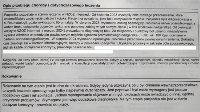 Dodatkowo cierpię na zespół ciasnoty przedziałów powięziowych przedramion, co powoduje silny ból rąk nawet przy niewielkim wysiłku oraz ciągłe pieczenie dłoni. Prawa ręka była już trzykrotnie operowana, niestety bez trwałej ulgi. Teraz gdy poruszam się o kulach ręce są jeszcze bardziej narażone i ból jest nie do zniesienia. Wciąż konsultuję mój przypadek u różnych specjalistów i szukam skutecznego leczenia.