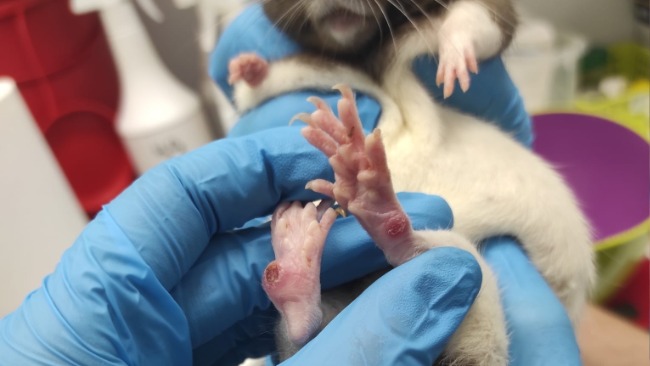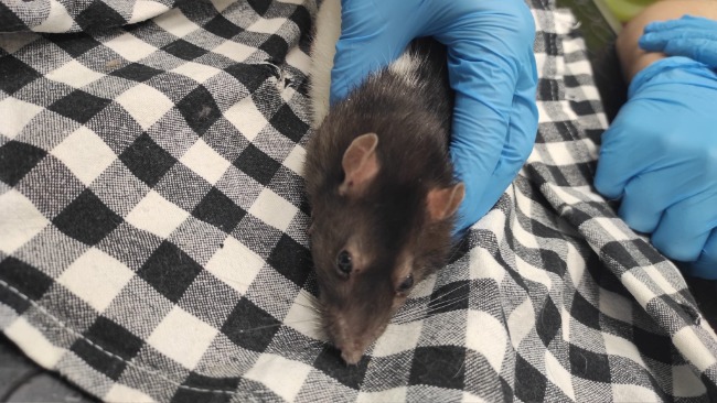 Szczurzynka – przerażona do granic możliwości. Ze strachu reaguje agresją, bo to jedyne, co zna. Na łapkach ma bolesne odgniotki – wynik życia na niewłaściwym podłożu, w brudzie, bez możliwości ruchu. Przed nami długa droga do odbudowania jej zaufania. Do życia w godności i wkoncu bez bólu...