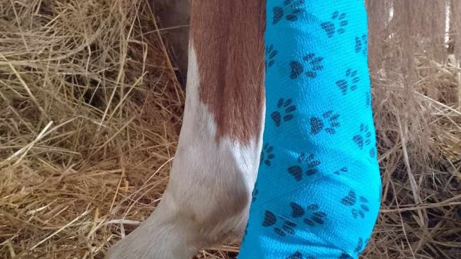 We wtorek jeszcze brykał wesoło wraz z kompanem po padoku, w środę rano pokazała się mała opuchlizna na wysokości pęciny, którą po zrobieniu okładu z Rivanolu zawinęliśmy opatrunkiem.