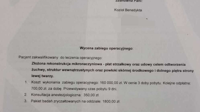 Operacja, gdy tylko uda nam się zebrać środki zostanie wykonana 12.02.2024 r. Celem operacji będzie odtworzenie zniszczonego piętra twarzy.