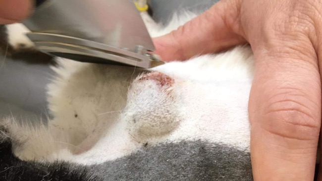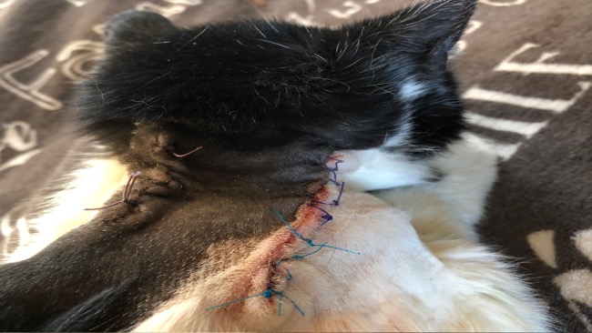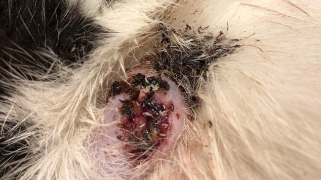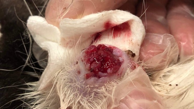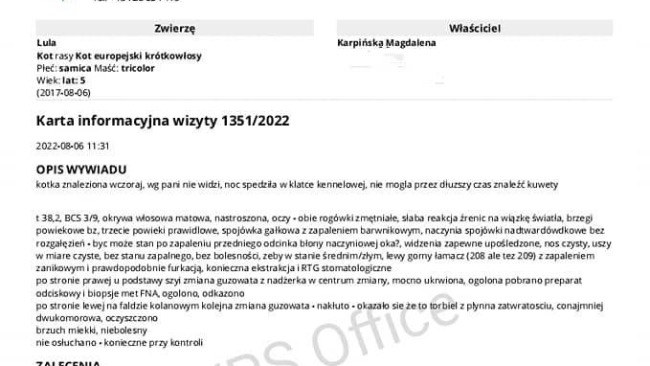 W niespełna godzinę kotusia została odebrana od Państwa. Opatrzyłyśmy z Basia ranę, podane antybiotyki i w sobotę do lekarza . Kocia ma na szyi perforujący guz z jajami much. Następnego dnia pełzały by w tej ranie robaki 🥺