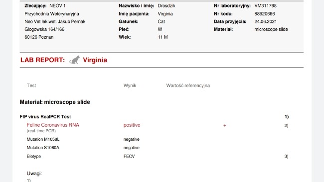 Wirginia to moja ukochana kotka, którą adoptowałam w grudniu 2020 roku. Od tamtej pory spędziłam z nią wiele pięknych chwil, zapewniałam jej najlepszą opiekę, a ona okazywała mi miłość i wsparcie. Niestety, dwa tygodnie temu zauważyłam zmiany w oku Wirginii i nie zwlekając odwiedziłam weterynarza. Okazało się, że Wirginia ma wysoką gorączkę, a morfologia i usg wskazywały na FIP. Kroplówka i leki przeciwgorączkowe pomogły tylko na chwilę; 28. czerwca otrzymałam potwierdzenie FIP po biopsji i badaniach.