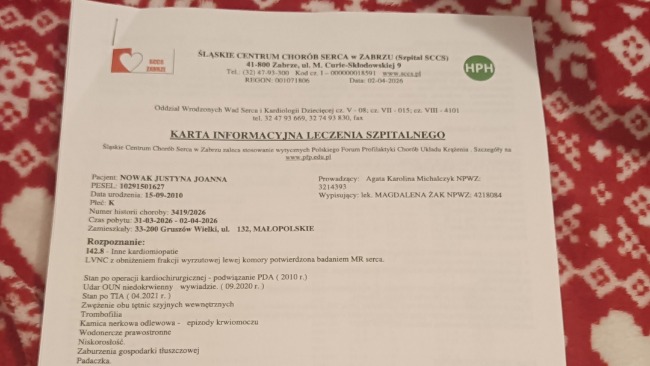Witam. Mam na imię Justynka i mam 16 lat. 15 września 2020 w swoje urodziny dostałam w szkole udar mózgu. Jego przyczyną była moja wada serca którą mam od urodzenia i która coraz bardziej się pogarsza.Stan mojego serca jest słaby.Po pierwszym udarze spędziłam w szpitalu 2,5 miesiąca gdzie przez ok. miesiąca leżałam, nie chodziłam, byłam rehabilitowana. W tym roku 19 marca 2021 dostałam drugi udar który był spowodowany przez covida. Po drugim spędziłam w szpitalu około 2 tygodnie. Niestety po obu udarach została mi sparaliżowana prawa dłoń. Biorę leki na stałe których z każdym pobytem w szpitalach mam ich więcej a które mają mi pomóc w normalnym funkcjonowaniu ale mam lepsze i gorsze dni.Oprócz udarów mam też inne choroby które wymagają leczenia, pobytów w szpitalu. Opiekują się mną rodzice (najwięcej mama) jest zawsze ze mną wtedy kiedy jej potrzebuje. Bardzo proszę o pomoc na leczenie i rehabilitacje oraz rekonwalescencję która jest mi też dalej potrzebna abym mogła być zdrowa. To nie wiele a dla mnie szansa na zdrowie którym chcę się cieszyć jak najdłużej.