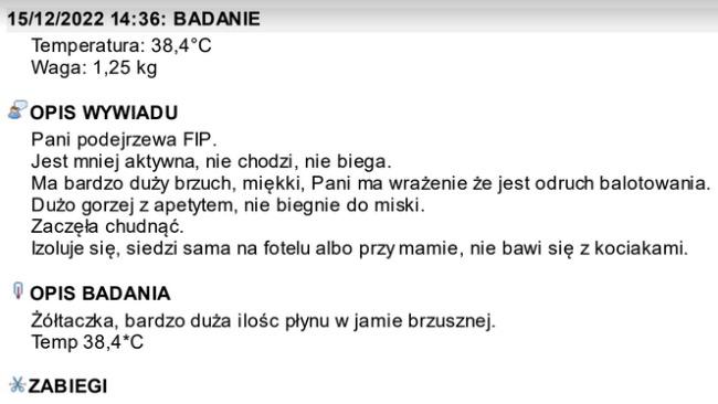 Gwiazdka ma w swoim malutkim brzuszku bardzo dużo żółtego płynu. Jego kolor, konsystencja i lepkość wskazują na jedno - zakaźne zapalenie otrzewnej. Oprócz tego koteczka ma żółtaczkę, którą widać gołym okiem (błony śluzowe i wnętrze uszu są zażółcone).