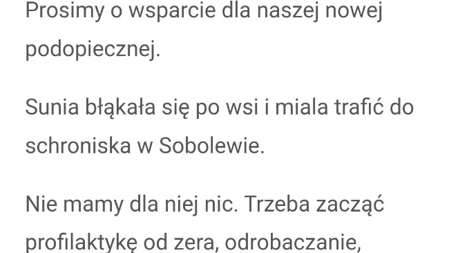 Malutka jest już pod Opieką Marioli Szymańskiej Hotel I Dom tymczasowy dla psów Wandalowo. Wspólnie zmieniliśmy kierunek podróży bo groziło jej schronisko w Sobolewie. Sunia już jest po wizycie w lecznicy. Ma ok 7 lat. Prawdopodobnie rodziła już parę razy, teraz tez jest w ciąży. Badania krwi w normie, więc ma umówiony zabieg. Niebawem będzie poszukiwać najlepszego domu 😊