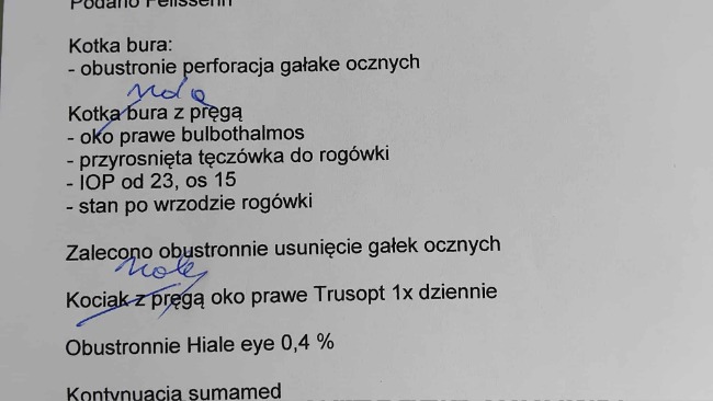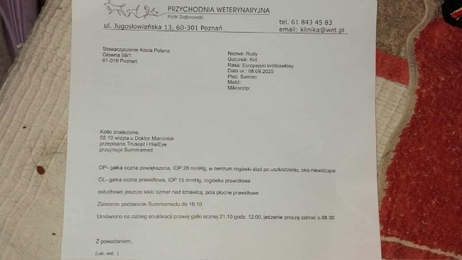 Mniejsza koteczka niestety oczka juz straciła, rudy kocurek widzi na jedno oczko, ale drugi jest już zniszone a ciśnienie w nim może spowodować pęknięcie gałki ocznej, dlatego po ustabilizowaniu ich stanu 21 października zostanie przeprowadzona operacja enukleacji gałki ocznej.