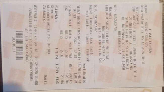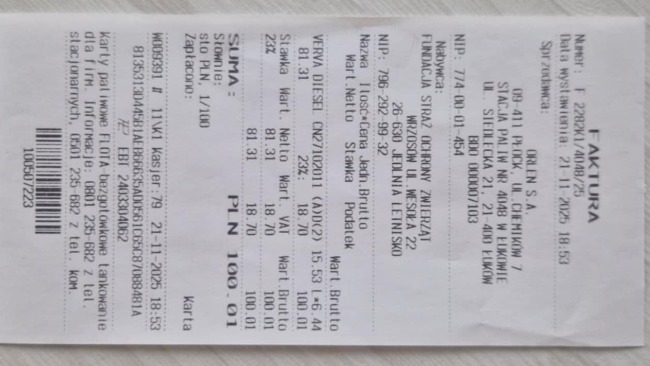 - Faktura nr F2282K1/4048/25 z dn. 21.11.2025r. na kwotę 100,01 zł (listopad 2025) za dojazd do schroniska w Sobolewie (realizacja programu Reporterzy)