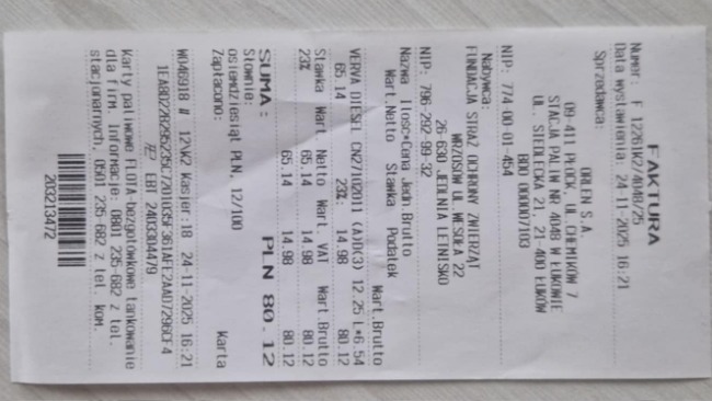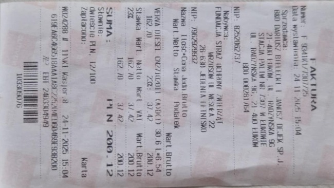 - Faktura nr F 12261K2/4048/25 z dn. 24.11.2025r. na kwotę 80,12 zł (listopad 2025) za dojazd do schroniska w Sobolewie w dniu protestu - 22.11.2025r.
