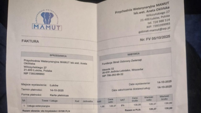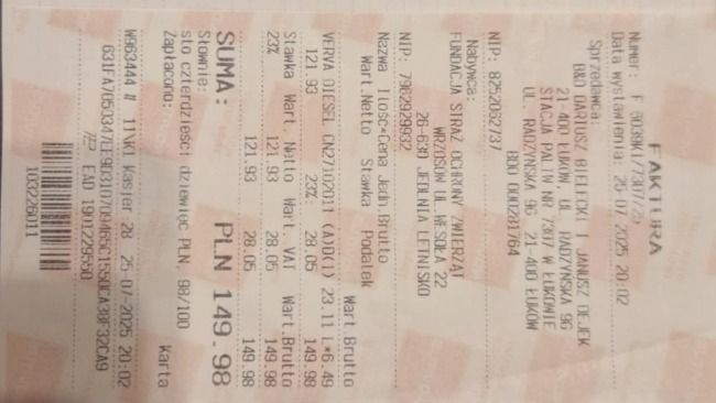 - Faktura nr 6039K1/7307/25 z dn. 25.07.2025r. na kwotę 149,98 zł (lipiec 2025) - poszukiwania, przewóz/doglądanie klatki, paliwo związane z ratowaniem i odławianiem owczarki niemieckiej, która błąkała się prawie miesiąc w Łukowie.