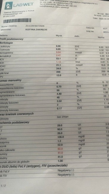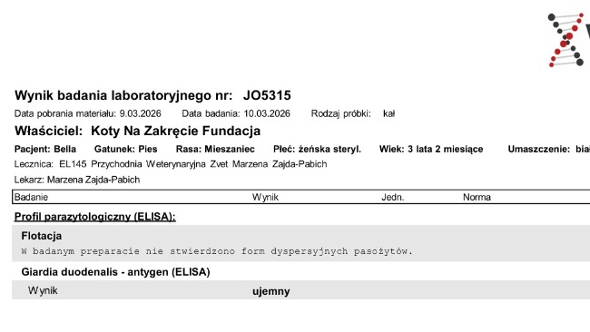 Bella ma około 3 lat, jest już wysterylizowana, zbadaliśmy jej również kał i krew oraz wykonaliśmy testy FIV/FELV - wynik ujemny. Bella jest zdrowa, wyniki krwi nie budzą w nas niepokoju, pasożytów brak.