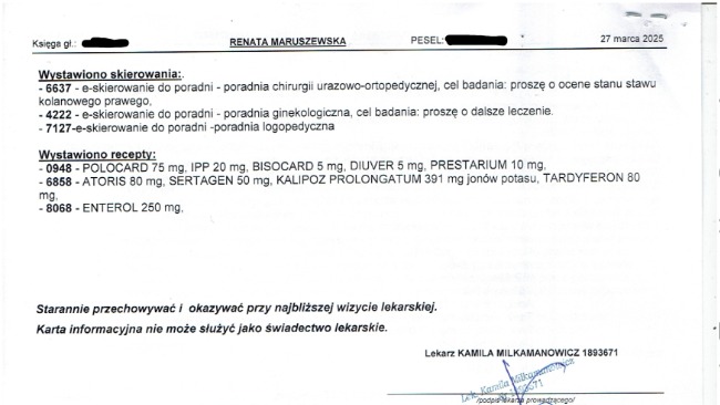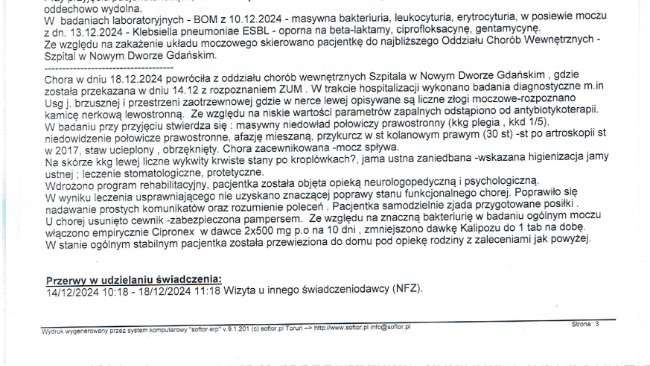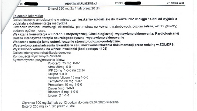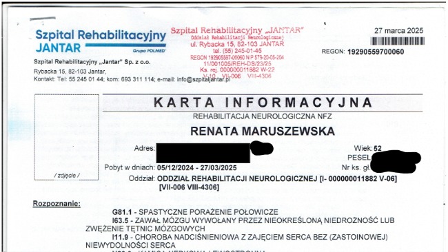 Przepraszam, że nie zaktualizowałem zbiórki wcześniej. Na początku mieliśmy bardzo dużo pilnych spraw związanych ze zdrowiem mamy, wizytami, dokumentami i organizacją codziennej opieki. Później, w natłoku obowiązków i codziennych trudności, zwyczajnie wypadło mi to z głowy. Przepraszam również za jakość i format zdjęć — niestety strona nie pozwala na dodawanie plików w normalnej formie, dlatego musiałem je odpowiednio dopasować. Załączam wypis ze szpitala oraz orzeczenie. Postaram się również w najbliższym czasie dodać faktury, paragony oraz potwierdzenia realizacji recept.