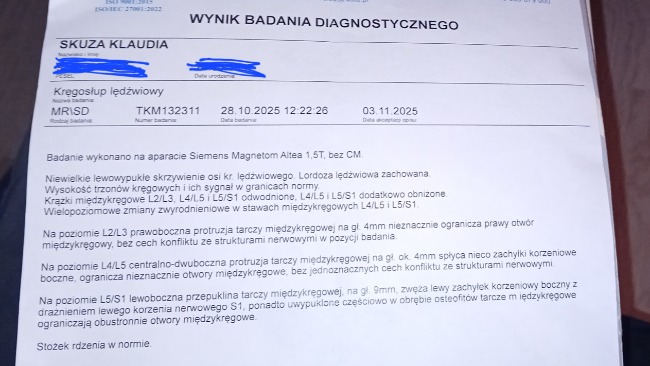 edited: 24.10.2018 miałam prywatną wizytę u neurochirurga w Kościerzynie. Lekarz patrząc na mój rezonans stwierdził że pomoże tylko operacja. Bez zastanowienia zgodziłam się gdyż lekarz powiedział że są już uszkodzone nerwy trzymania moczu a gdy okaże się że coś je uszkadza dalej to mogę do końca życia nie trzymać moczu. Dostałam telefon z terminem operacji odbędzie się ona 16 listopada w Grudziądzu lecz muszę się zjawić na oddziale już 15 listopada na 8:30 aby odbyły się podstawowe badania. Zostanie usunięta przepuklina kręgosłupa. Dowiedziałam się ze na operację zostanę całkowicie uśpiona. Trzymajcie proszę kciuki. Stres jest ogromny Ale wiem jedno... TO DLA MOJEGO ZDROWIA.